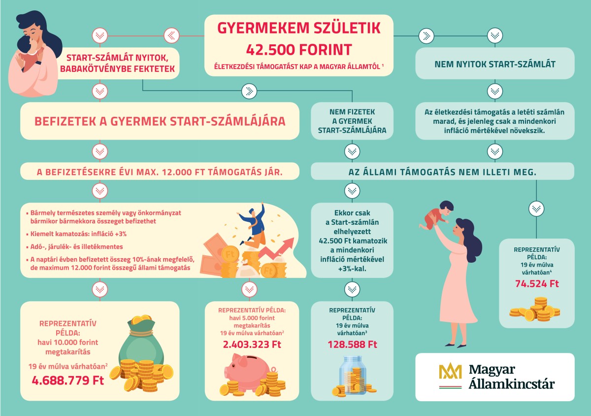 - A Start-számlára a befizetések után járó korábbi 10%-os állami támogatás maximumát is megemelte a kormány 2022-ben: már évi 12 ezer forint (a korábbi 6 ezer forint helyett). A rendszeres gyermekvédelmi támogatásban részesülő gyermekek esetében 24 ezer forint lett (12 ezer forint helyett).